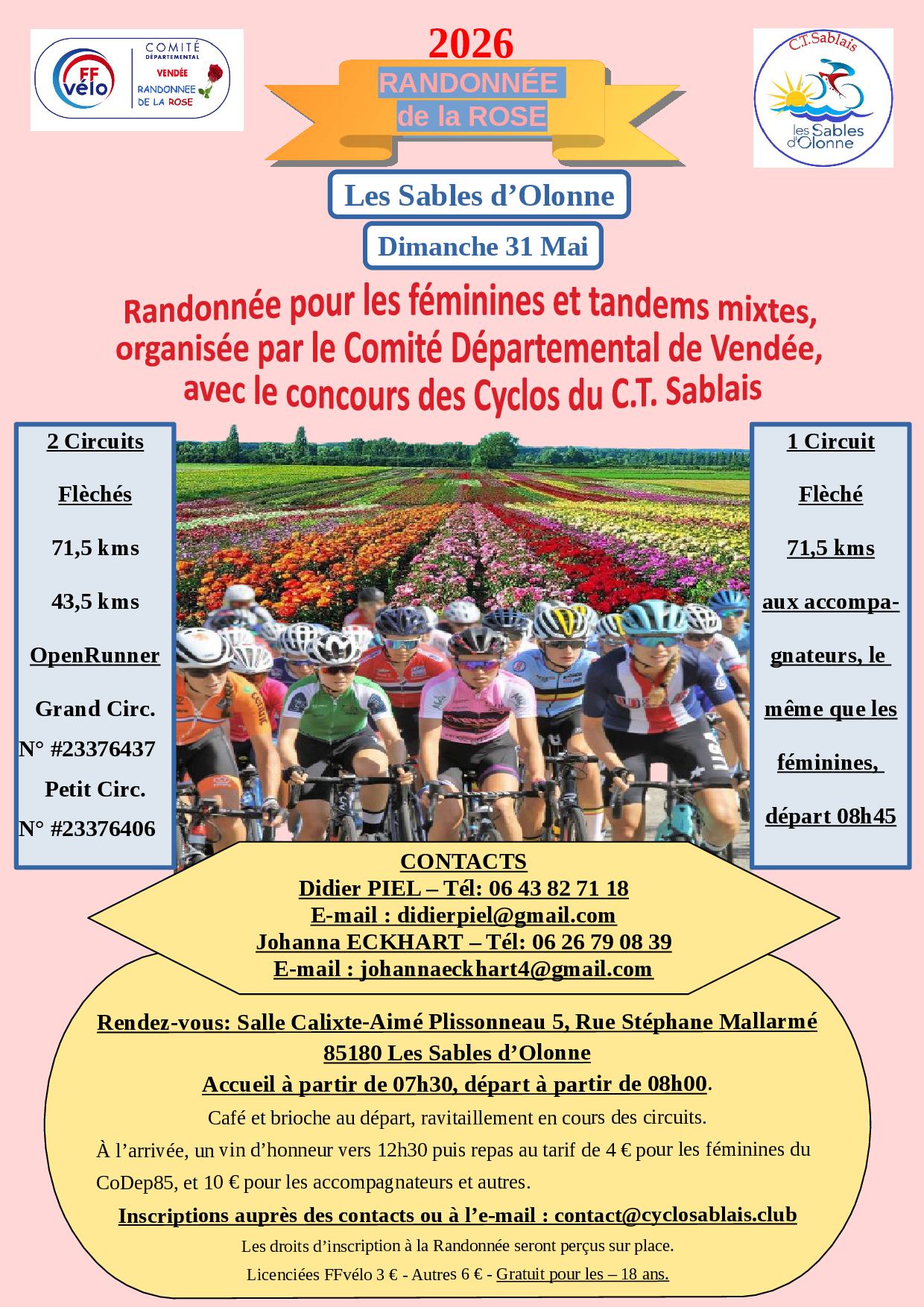 La randonnée de la Rose cyclotourisme est organisée par le CoDep 85 FFvélo et destinée uniquement aux féminines.